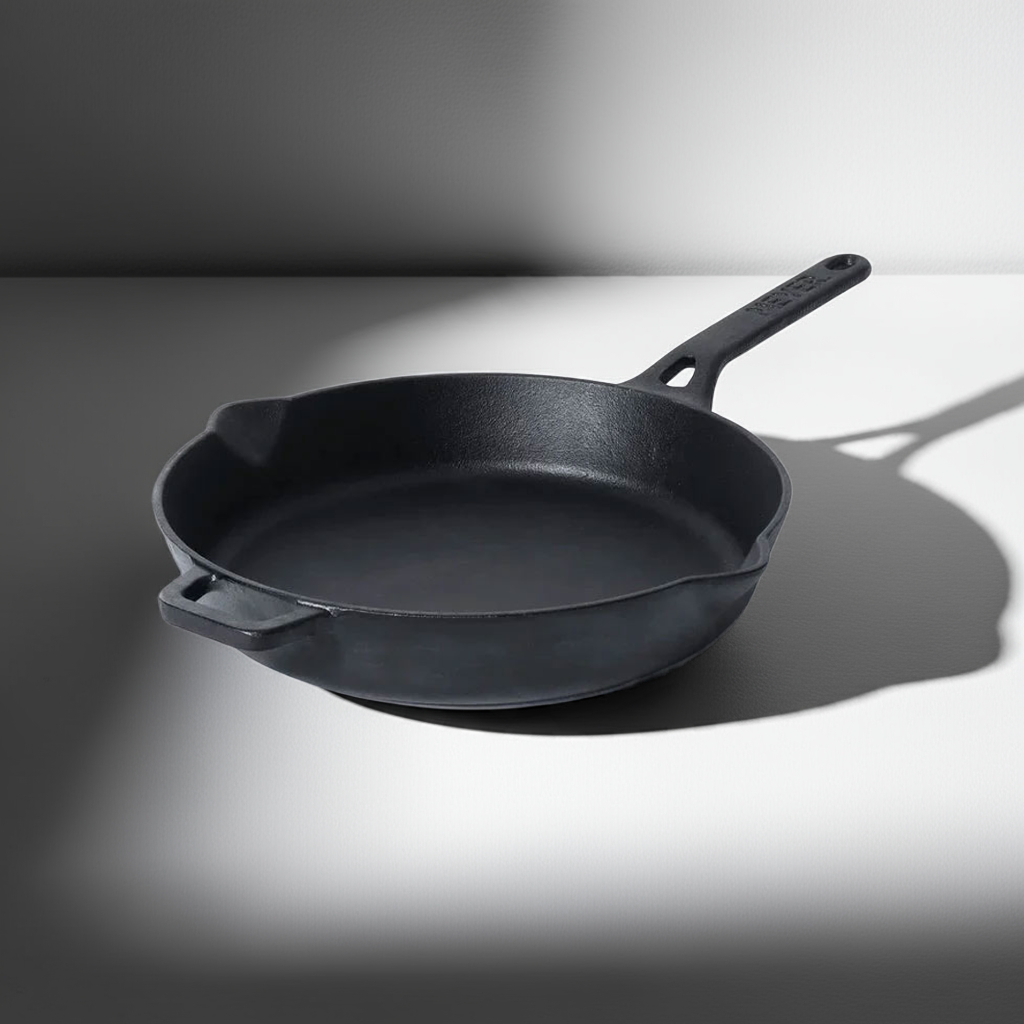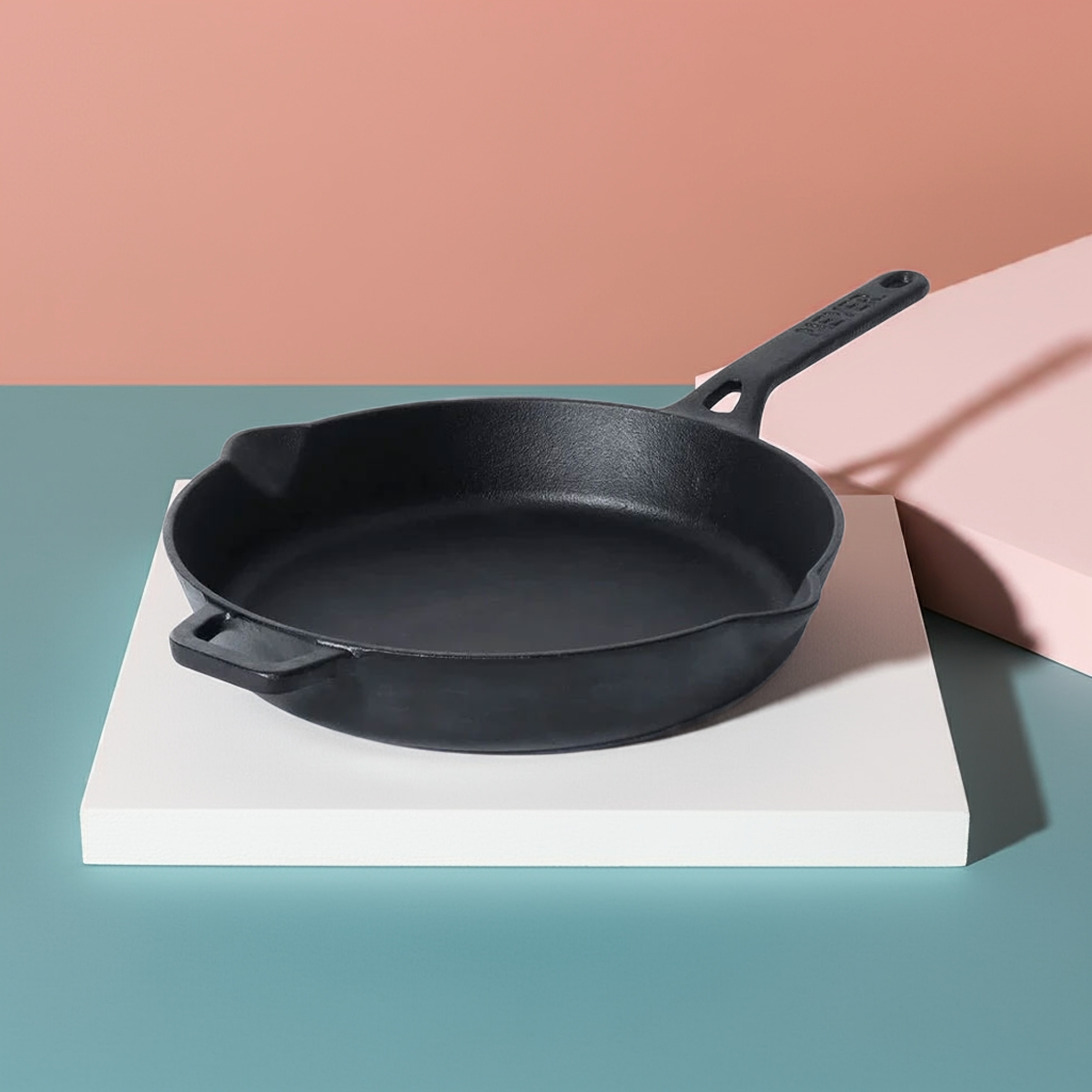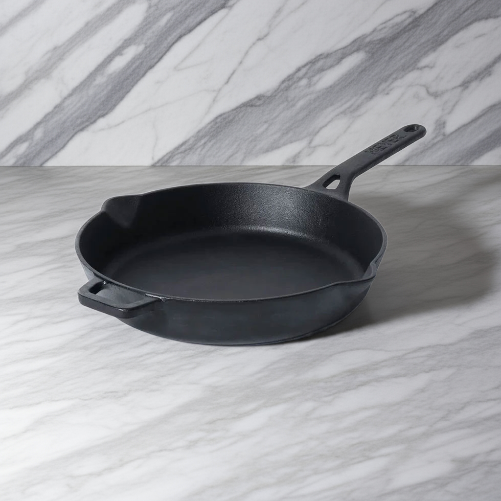 Large skillet and frying pan. Perfect for a family of up to 4 members. Great for stir-fried vegetables, searing meat, or stews and curries. Made from heavy-duty cast iron. 12-inch diameter with an 8-inch handle. single-piece construction. Durable and long-life material.
